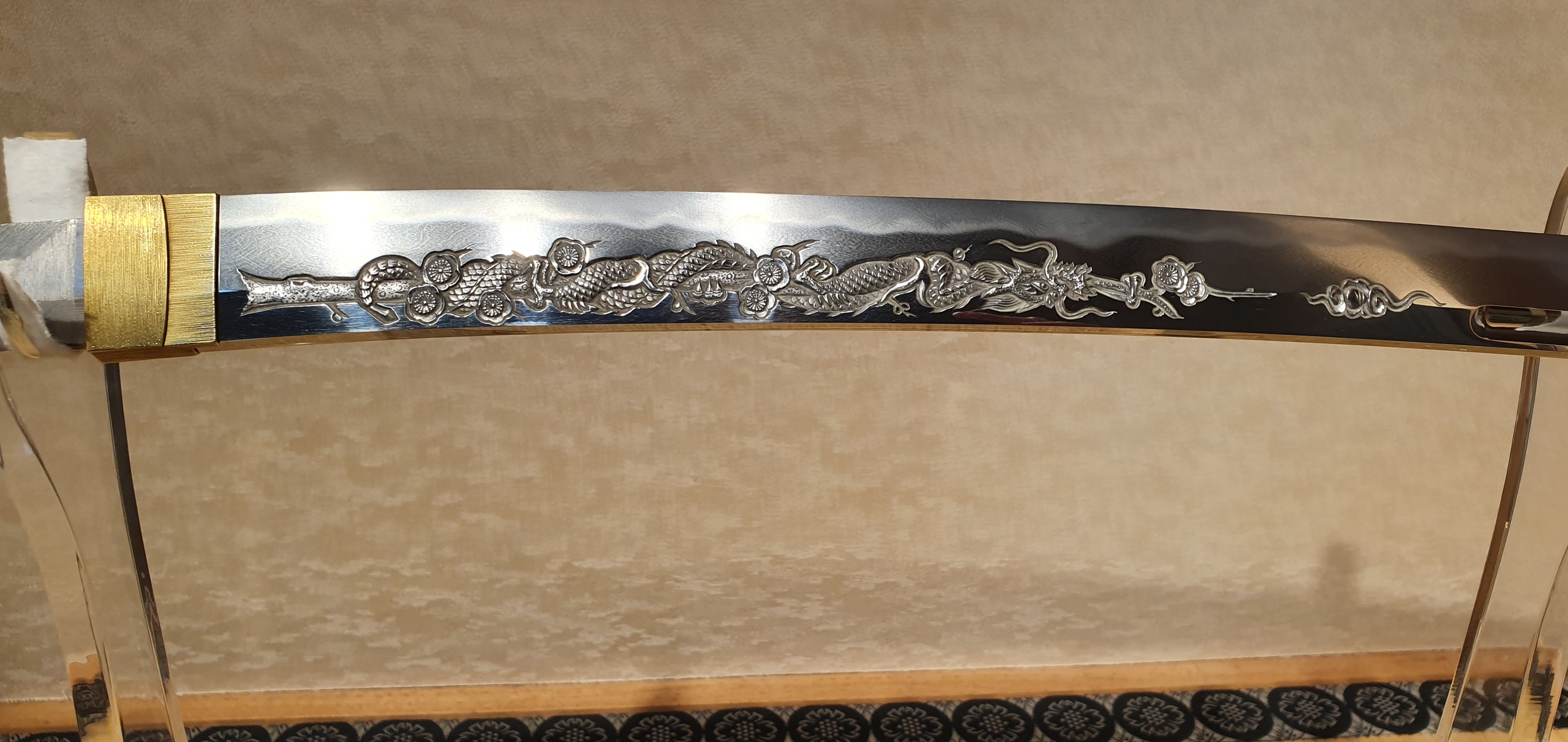 Svärdet nedan är  nytillverkat stålsvärd av tamahagane av mästersmeden Gassan Sadatoshi.  Motiv i gravyren en drake som slingrar sig runt ett plommonträd.
