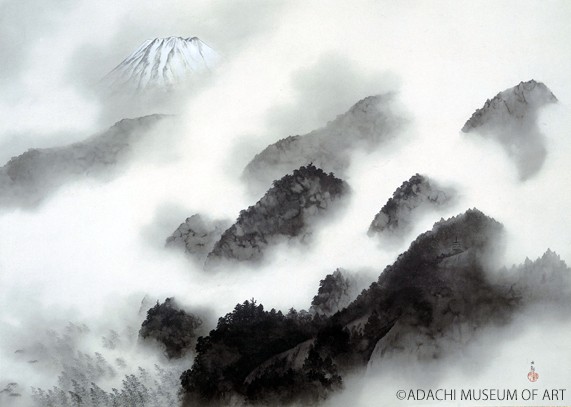 Målningen till vänster är Mountain after a shower av Yokoyama Taikan. Bilden är lånad av och kan ses på Adachi Museum of Art i Shimane, Japan.  https://www.adachi-museum.or.jp/